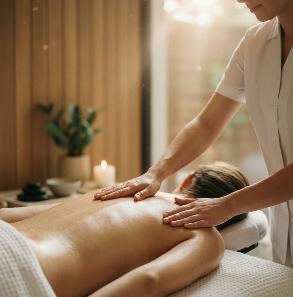 Our therapist arrives with all equipment: massage table, fresh linens, premium products, and sanitized tools